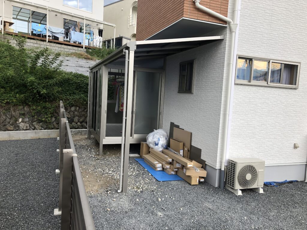 部分囲いの施工をさせて頂きました。施工前施工後テラスとサンルームが合わさった商品になります。サンルームをとしても使え、自転車等をテラス部分に置くこともできます。